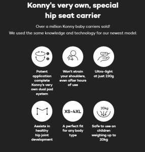 The Konny Dual Support Hip Seat Carrier is a lightweight, ergonomic hip-seat carrier designed to make carrying your baby easier and more comfortable. It features a unique Dual Support System, consisting of a Bottom Pad and Back Pad, providing enhanced stability and support for both the parent and the baby.