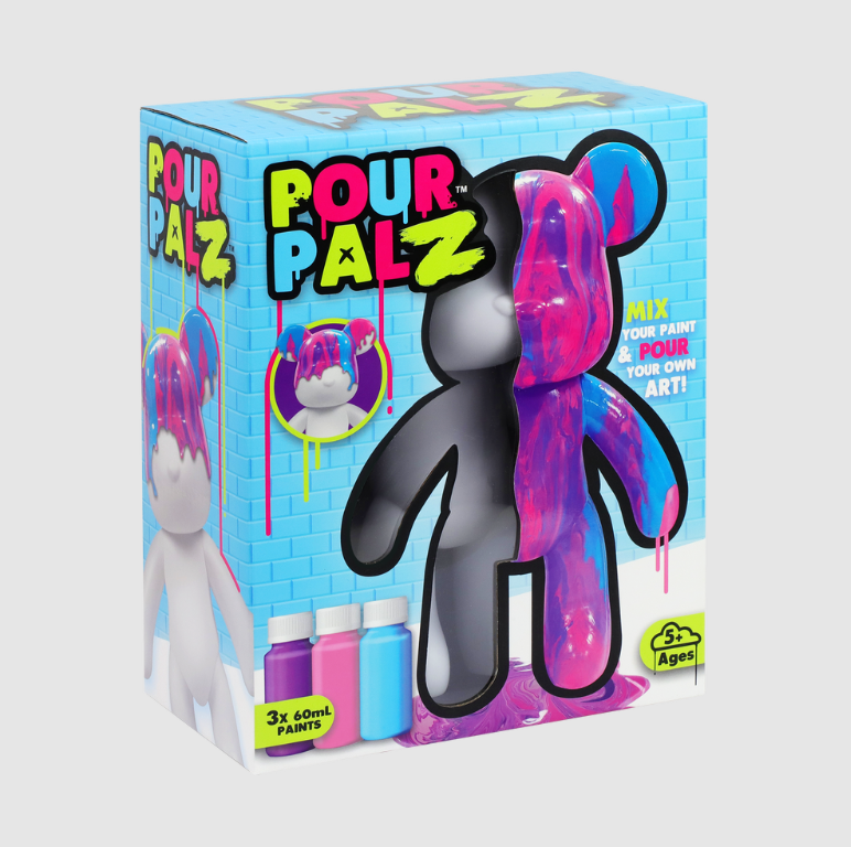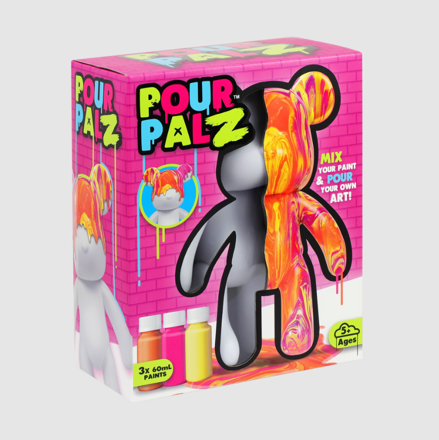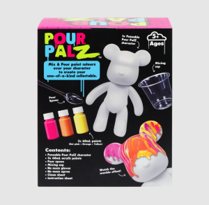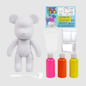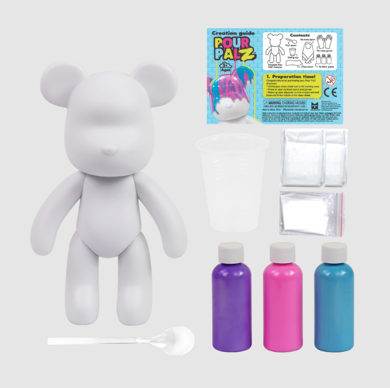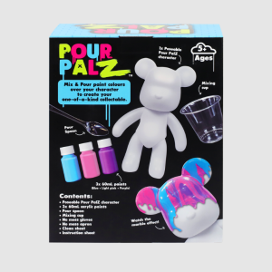 Contents: x1 Pour Palz large bear figure, x3 paints, x1 pour spoon, x1 no-mess mat, x1 mixing cup, x1 glove*