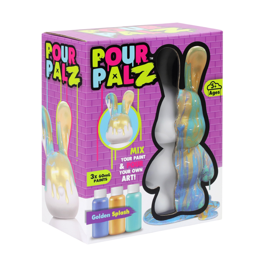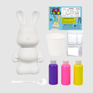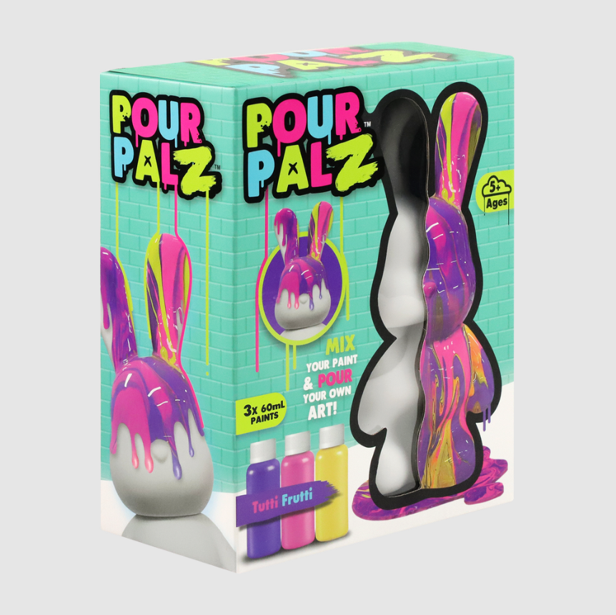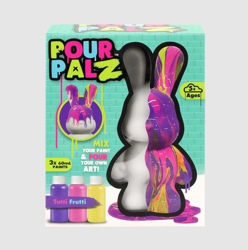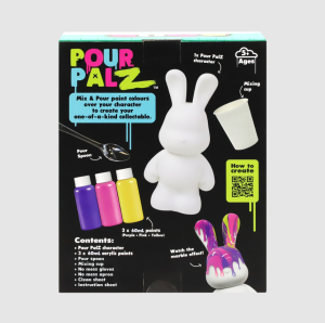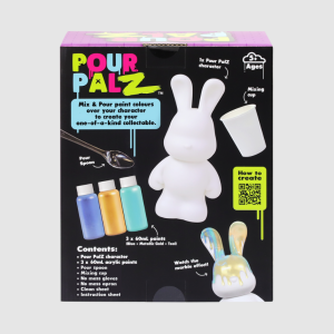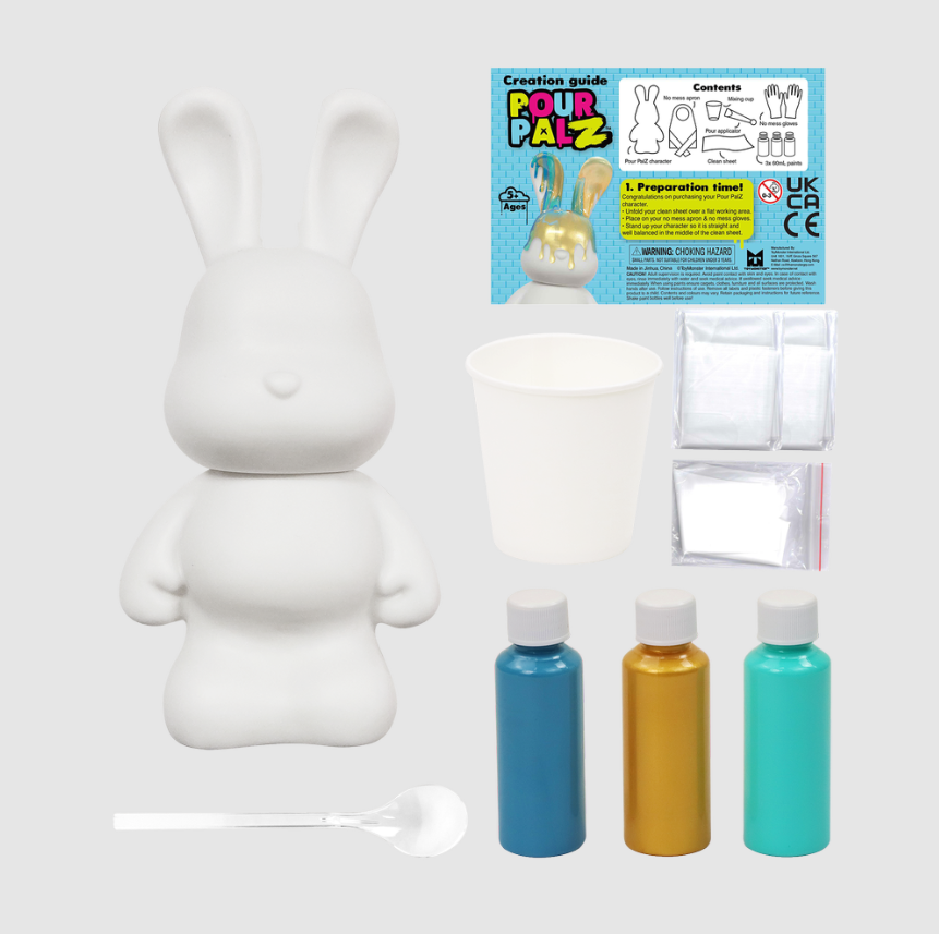 Contents: x1 Pour Palz large bunny figure, x3 paints, x1 pour spoon, x1 no-mess mat, x1 mixing cup, x1 glove*